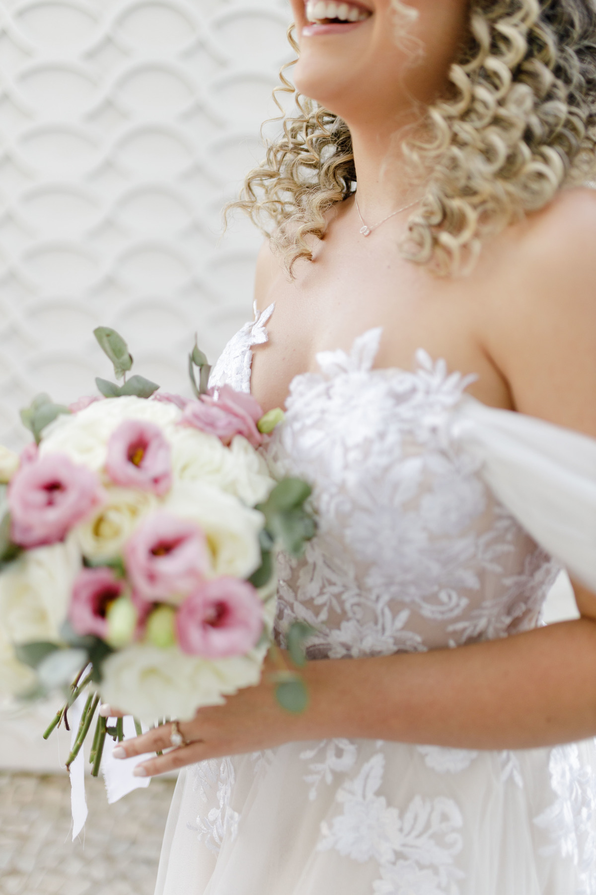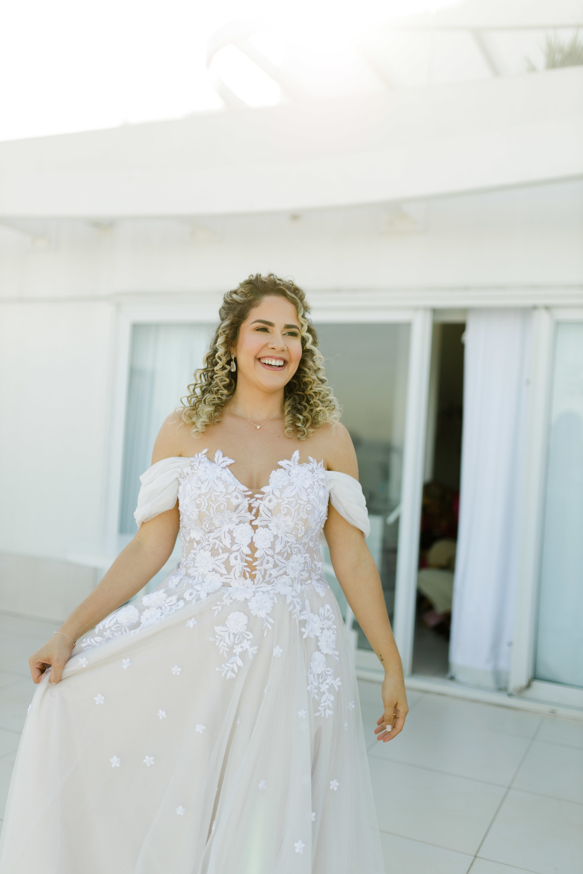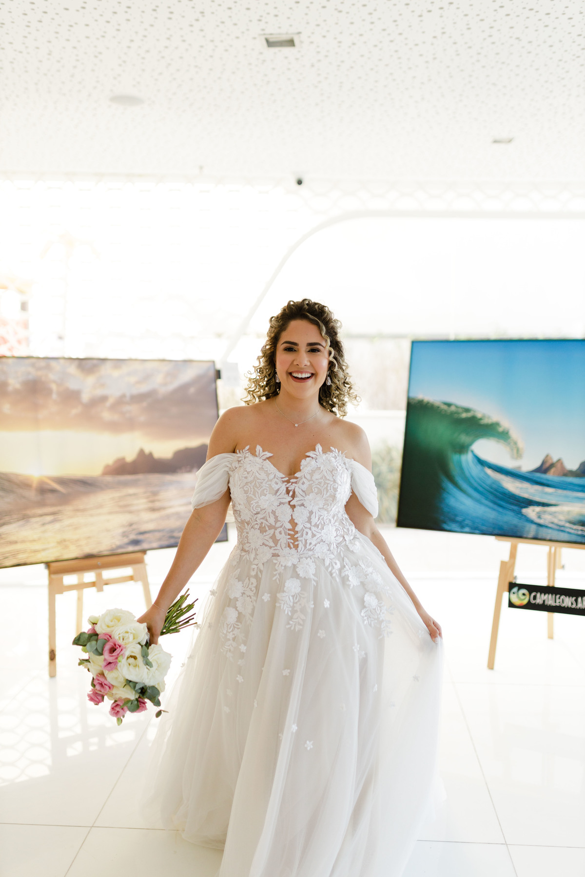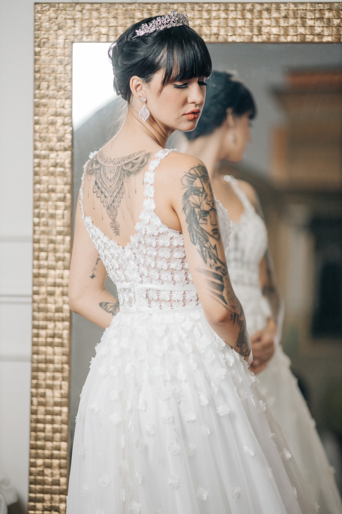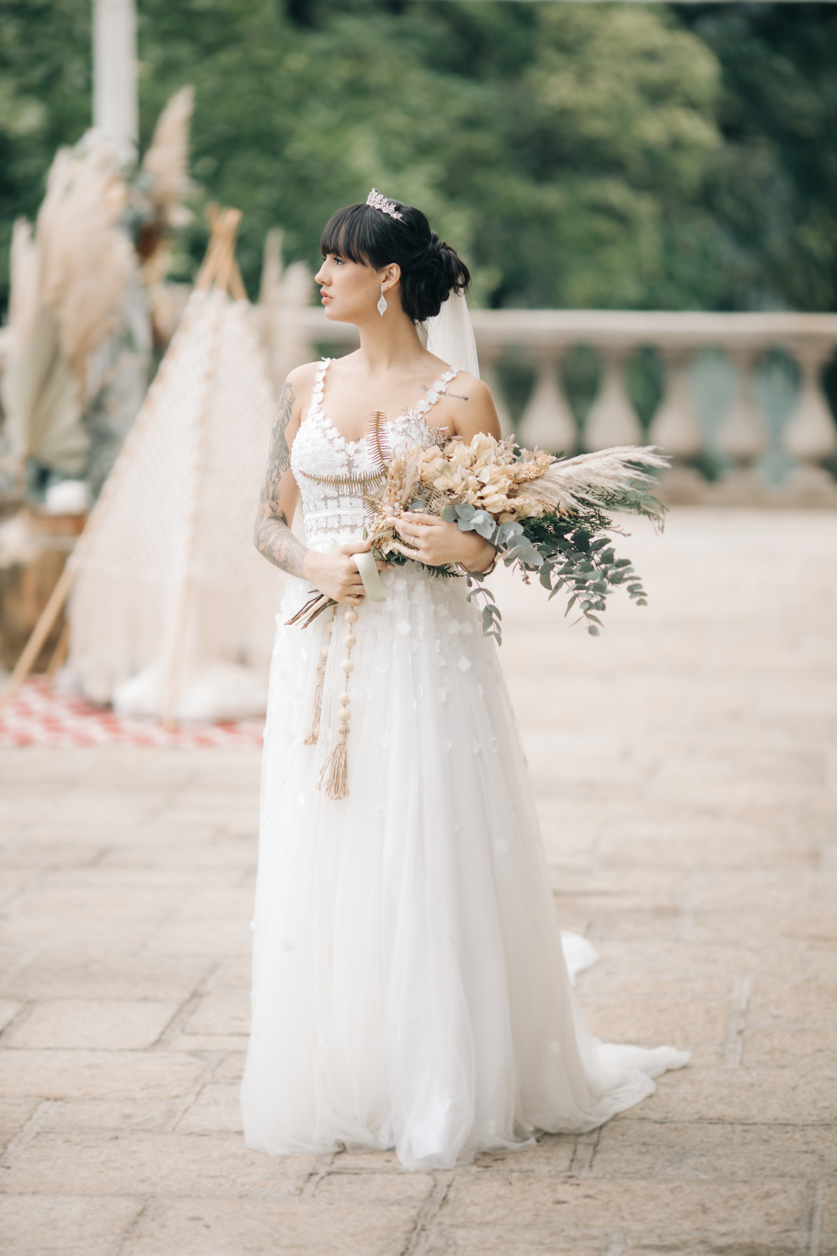 Os elementos que encontramos nos vestidos de noiva boho chic são fluidez, rendas, pouco brilho e pedraria, franjas, tule e renda guipir por exemplo.